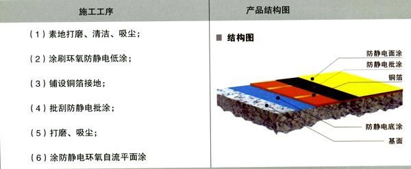 ⑤防靜電中涂:防靜電中涂將環氧樹脂加入適量的石英砂,用鏝刀將其均勻涂布數道;